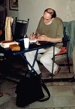 Pirotte singing a copy of his book at a priory in Aude, 2005