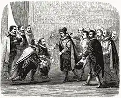 On 27 December 1594, Châtel managed to gain entry to the King's chamber. When Henry stooped to help two officials rise who had knelt before him, Châtel attacked him with a knife, striking his lip. He was at once arrested (prevented from leaving the room by the court jester Mathurine de Vallois) and condemned for the crime of lèse majesté. As the law prescribed, first Châtel's hand, with which he had struck the King, was burned with molten sulfur, lead and wax. He was then executed by dismemberment.[1]