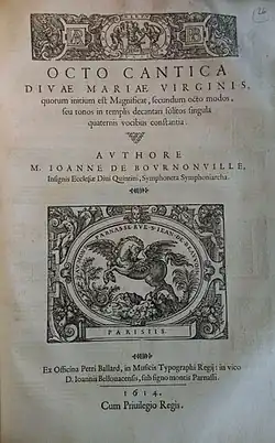 Title page of the Octo cantica de Bournonville (Paris, 1614). Paris ICP.