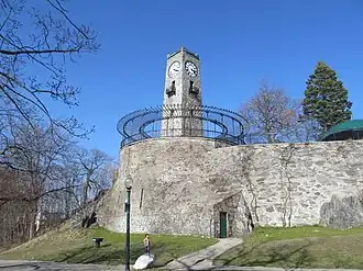 Jenks Park is a city park of Central Falls, Rhode Island. The city's only large park, its development began in 1890 on land donated by Alvin Jenks. Its centerpiece is Cogswell Tower, designed by Pawtucket architect Albert H. Humes and built in 1904. A gift of Caroline Cogswell, the tower stands 18 feet (5.5 m) square and 70 feet (21 m) tall.[2] It has been the symbol of the City of Central Falls since its construction. The tower is supported by a brick barrel vault resting atop the historic Dexter's Ledge, from which, during King Philip's War in 1676, Native American scouts saw the approach of Captain Michael Pierce, and a company of Plymouth soldiers from the heights. Pierce's forces were ambushed and nearly annihilated by the Native Americans in "Pierce's Fight" at a site along the Blackstone River on March 26, 1676, where Pierce Park now stands.