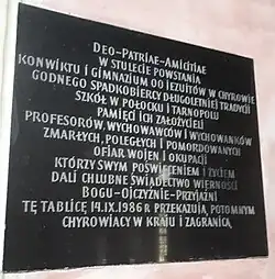 On the 100th anniversary of the college's foundation, a commemorative plaque was installed in the church of St. Barbara in Kraków, Poland on 14 September 1986. It was sponsored by "Chyrowiak" Old Boys, both in Poland and abroad to recall the long traditions and legacy of the earlier Jesuit colleges of Polotsk and of Tarnopol of which Chyrow became an honourable successor. The plaque also pays tribute to the founders of the college, its teachers, prefects and pupils and all those among them who paid the ultimate sacrifice during its existence, dying or being murdered in the ensuing historical conflicts, including the two world wars. The motto on the plaque reads: Deo - Patriae - Amicitiae.
