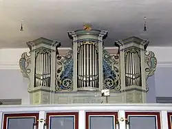 In 1715 the church was refurbished and altered.[3] The nave has been lengthened towards the east and the windows were altered in their forms.[2] The new, longer nave received a flat ceiling above a circular ledge, carried by busts of angels (German: Engelsflüchte(n)).[2] On the southern side a chapel was added to the building, which now houses the heating system.[2]