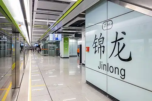 Jinlong Station (simplified Chinese: 锦龙站; traditional Chinese: 錦龍站; pinyin: Jǐnlóng Zhàn; Jyutping: gam2lung4 zaam6) is a station of Guangzhou Metro Line 7, located underground at the intersection of Fochen Avenue and Baichen Road in Foshan's Shunde District.[1] The station was opened on 1 May 2022, with the opening of the western extension of Line 7.[2][3]