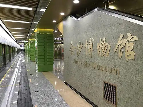 Jinsha Site Museum station (Chinese: 金沙博物馆站; pinyin: Jīnshā Bówùguǎn zhàn) is a station on Line 7 of the Chengdu Metro system in Chengdu, Sichuan, China. It was opened on 6 December 2017.[1][2] The station serves the nearby Jinsha site and is located at the intersection of Qingyang Avenue and Jinsha Site Road.