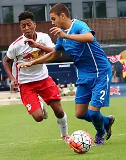 Initially, he played as a left-back or a central midfielder until Dinamo academy coach Dalibor Poldrugač moved him to the centre-back position. Soon after, Gvardiol started drawing interest from prominent European clubs,[16] including Manchester City, Lille, Borussia Dortmund, RB Leipzig, Bayern Munich, Ajax, Inter Milan and Roma.[17][18][19][20] He played a key part in Dinamo's 2018–19 UEFA Youth League campaign,[21] where they reached quarter-finals before losing 4–2 to Chelsea in a penalty shootout.[22] After being impressed by his performances for youth teams, senior Dinamo coach Nenad Bjelica called Gvardiol up to the senior team for pre-season games in Slovenia in summer 2019. On 2 July, he scored in a 2–0 friendly win over Austria Klagenfurt.[23] On 10 October 2019, he was included in The Guardian's Next Generation list.[24]