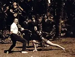![]() de Tuscan, center, husband Bela, left, with the USO at Waikiki Beach in 1945 | |