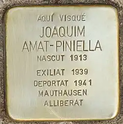 However, the Republican prisoners were deemed to be stateless and Franco's minister and brother-in-law, Ramón Serrano-Suñer, made a deal with the Nazis whereby all Republican prisoners of war should be transferred to forced labour camps.[1] Amat-Piniella and his fellow prisoners were moved to the Mauthausen concentration camp in January, 1941. In an interview in 1973, Amat-Piniella described his first contact in the camp with other Spanish prisoners who had been in the camp for a few months: