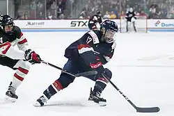 Lamoureux-Davidson also won silver medals for the United States women's national ice hockey team at the 2010 and 2014 Winter Olympics.[2] Lamoureux played one season of NCAA hockey for the University of Minnesota and three for the University of North Dakota. She competed for a year with the Professional Women's Hockey Players Association, a worker's union pushing for equality in the sport, and retired from playing in 2021.[3] After her retirement, Monique and her twin sister published their first book Dare to Make History.[4] The sisters also founded the Lamoureux Foundation, which funds educational and extracurricular programs for children in need, primarily in their home state of North Dakota.[5]