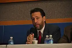 Miller received national press attention after campaign security guards handcuffed and made a 30-minute private arrest of a journalist following a town hall campaign event in an Anchorage public school on October 17, 2010.[41][42][43][44][45] Bill Fulton, the owner of the unlicensed security firm said the journalist, Tony Hopfinger, was trespassing at a private event and had assaulted a Miller supporter by shoving him. Fulton was subsequently named as the federal informant who supplied weapons to a radical accused of plotting the deaths of officials in Fairbanks.[41][43][46] The Anchorage Daily News described the event as public,[41] and a school district spokesperson noted that the hallway where the arrest took place was a public area.[47] Hopfinger said he had been trying to ask Miller whether he had been disciplined while working as a local government lawyer,[45] when he was suddenly surrounded by guards and supporters, and bumped or shoved against one of them.[42][43] No charges were filed against anyone in relation to the incident.[48] Miller responded that Hopfinger's actions were "beyond the pale" because he had followed Miller into the men's room.[49] Hopfinger said that he asked no questions until after the townhall event when both men were back in the hallway.[43]