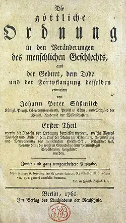 Johann Peter Süßmilch or Süssmilch (September 3, 1707 in Zehlendorf – March 22, 1767 in Berlin) was a German Protestant pastor, statistician and demographer.[1][2] He is most well-known for his work The Divine order in the changes in the human sex from birth, death and reproduction of the same, which was an influential work in demography and the history of population statistics.[3][4][5]