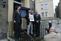 The unveiling of a Blue Plaque in 2015 in memory of John Barlow on his former home at 1 Pilrig Street, Edinburgh, in the presence of - from left to right - the Lord Provost, The Rt Hon Donald Wilson, John Barlow's two great-grandchildren, Antony and Nicholas Barlow, Professor Brendan Corcoran from the Royal (Dick) School of Veterinary Studies, University of Edinburgh