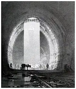 Two views of the Kilsby Tunnel are interesting; in the first "a working shaft," the powerful light bursting through the aperture in the roof, and shewing the group of workmen and horses with one of the operators descending, affords a striking idea of the vastness of the Tunnel itself. "the visibleness of the ray of light from the shaft," says Mr. Britton, "is occasioned by the opaqueness and humidity of the atmosphere, arising from the want of the ventilator."[17] In a 2008 article Mike McKiernan commented this same picture:
