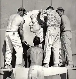 The memorial was commissioned by the citizens of Barnstable, Massachusetts and dedicated on July 8, 1966. Donald Durell of Falmouth, Massachusetts was the memorial's architect, and J. Paul Lanza of Simsbury, Connecticut (formerly of Osterville and West Yarmouth, Massachusetts), was its general contractor.[4] The sculptor Agop Minass Agopoff,[5] who Gloria Vanderbilt recommended to President Kennedy's widow Jacqueline, created the bust profile. Jose Greco III, nephew of the dancer Jose Greco, cast the bronze. The John Stevens Shop of Newport, Rhode Island, carved the letters on the wall and around the reflecting pool. Materials were primarily sourced from Cape Cod, Massachusetts.