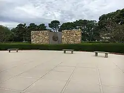 The John F. Kennedy Memorial is located on Ocean Street in Hyannis, Massachusetts. It overlooks Lewis Bay, where President Kennedy often sailed while in Hyannis Port, Massachusetts. The memorial is a large stone wall with a bronze medallion on each side. President Kennedy's left bust profile is on the front medallion, facing the bay. The Great Seal of the United States[1] is on the back, facing Ocean Street. The memorial’s landscaping includes plantings, lawn, a large concrete terrace, bluestone benches, and a reflecting pool and lit fountain that invokes the John F. Kennedy Eternal Flame at Arlington National Cemetery.[2] The reflecting pool is surrounded by bluestone engraved with the quote, “I believe it is important that this country sail and not lie still in the harbor.” It comes from President Kennedy's Radio and Television Report to the American People on the State of the National Economy given August 13, 1962.[3]