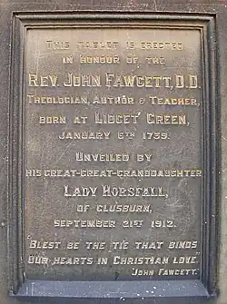 1912 plaque commemorating Fawcett, located in the New Testament Church of God in Bradford. According to the plaque, Fawcett was born on 6 January 1739 in Lidget Green, Bradford.