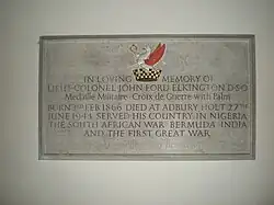 Elkington's youngest son served with the 10th battalion of the Rifle Brigade during the Second World War and was killed in action near Bou Arada, Tunisia on 19 January 1943. Elkington bestowed a stained glass window in his son's honour at the Church of the Ascension in Burghclere.[1] Elkington died on 27 June 1944, before it could be unveiled.[21][1] The window, with additional plaques honouring Elkington and his son-in-law Sir Richard de Bacquencourt des Voeux (who was killed while commanding the 156th Parachute Battalion at the Battle of Arnhem on 20 September 1944), was unveiled in May 1946 by Montgomery. Mary Elkington died on 26 May 1956.[1] Elkington's tunic is held in the collection of the Warwickshire Regiment's Museum.[20]: 128