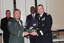 Rossi presents a gift to Lt. Gen. Junji Suzuki, vice chief of staff of the Japanese Ground Self Defense Force (left) during a dinner celebrating the 50th Anniversary of JGSDF Annual Service Practice held at the Centennial Banquet and Conference Center on November 7, 2014.