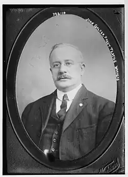 Originally from Lancashire, England, he began working as a boy as a mule spinner in the city's cotton mills. Active in the craft union movement, he was blacklisted by employers due to union activity and emigrated to the United States. He settled in the textile hub of Fall River, Massachusetts and was eventually elected treasurer of the National Mule Spinners' Organization of the United States and Canada. While in that office in 1902, he was elected president of the UTW. During his time as president, the UTW largely ignored textile workers who were not skilled white men, as was common in unions affiliated with the American Federation of Labor. As such, he was a vocal opponent of the Industrial Workers of the World (IWW), which was an anti-capitalist industrial union which sought to organize all textile workers into the same union regardless of race, gender, nationality, or skill. To undermine the IWW, Golden collaborated with company officials and frequently sent strikebreakers to IWW-led strikes, including the 1907 Skowhegan textile strike, the 1912 Lawrence textile strike, and the 1913 Paterson silk strike.[2] After the strike, IWW member and songwriter Joe Hill satirized Golden in the song "John Golden and the Lawrence Strike."[3] Golden became ill during the 1921 UTW convention and died in Brooklyn, New York on June 9. He was buried in Fall River.[1]
