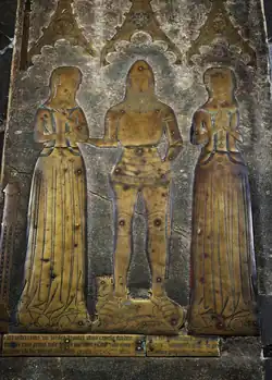 Monumental brass of John Hawley (d.1408) in St Saviour's Church, Dartmouth. He is dressed as a fully-armed knight, flanked by his two wives