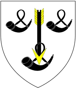Arms of Hawley: Argent, three hunting horns and a broad arrow sable in pale feathers and head or[1]