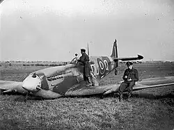 A Spitfire of No. 485 Squadron which made a belly-landing; Houlton sits on its wing
