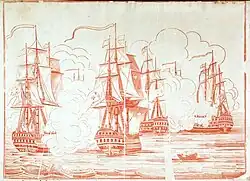 John Houlton Marshall was the son of Elias Marshall, master shipwright, of H.M. Careening Yard, Halifax.[1][2] He entered the Royal Navy in 1778. He was promoted to lieutenant on 30 June 1794 and by 1799 was serving as first lieutenant of the 38-gun frigate HMS Naiad. As such he fought at the Action of 16 October 1799 where Naiad and three other British frigates captured two Spanish frigates which were transporting large amounts of treasure. Marshall was still serving in Naiad on 17 May 1801 when he commanded a cutting out expedition at Pontevedra which captured the Spanish packet l'Alcudia and destroyed her consort El Raposo.[3] On 13 July 1804 he joined the 100-gun ship of the line HMS Britannia, and he fought on board her at the Battle of Trafalgar on 21 October 1805. His share of the prize money was 65 pounds 11s 5d plus a Parliamentary Award of 161 pounds.