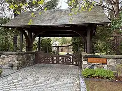 Although the exterior is clearly Tudor Revival in character, the interior has essentially Colonial Revival styling applied to a Tudor Revival layout. The entry leads into a great hall, from which other living areas are accessed via stairs and hallways. The great hall is lavishly decorated with Colonial Revival woodwork, including Tuscan columns, paneling, and crown molding. Similar details, although less elaborate, are also found in the private spaces upstairs. A parlor space lies on the ocean side south of the great hall, with a library behind. The dining room is north of the great hall, with the giant hearth obscuring the entry into the butler's pantry, which connects the dining room to the kitchen spaces in the service wing. The estate includes the original carriage house and caretaker's house, which were built at the same time as the main house.[3]