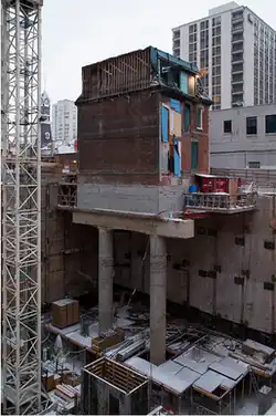 In 2012, 2013, and 2014, the block surrounding the house was redeveloped into a 50-story highrise, and extraordinary steps were taken to preserve the John Irwin House.[1][3] The house was temporarily moved to a concrete platform, supported by deep piles that extended through what would be several underground floors, to bedrock.[6] When the highrise is complete, the historic house will be repurposed as commercial space.[7]