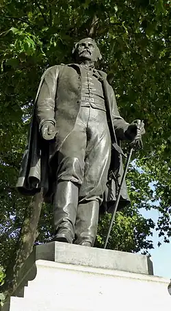 A statue of him stands at Foyle and Londonderry College (having been, originally, erected in Lahore). The statue, by Sir Joseph Edgar Boehm, once showed Lawrence with a pen in one hand and a sword in the other, along with the caption "By which will you be governed?". The pen and sword were used to illustrate his versatility as an administrator and a soldier. Vandals have since damaged the sword. Another statue of Lawrence stands in Waterloo Place in central London. The inscription on the base of the statue originally reads "John First Lord Lawrence, ruler of the Punjaub during the Sepoy Mutiny of 1857. Viceroy of India from 1864 to 1869. Erected by his fellow subjects, British and Indian, A.D. 1882.," but the word "Punjaub" (Punjab) has been defaced and rendered illegible by vandals.