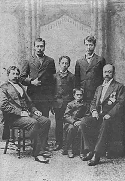 John Mākini Kapena (far right) with John Lot Kaulukoʻu (far left) and three Hawaiian students in San Francisco en route to Japan and China, 1882