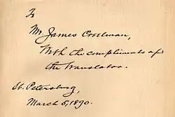 An inscription made by John Martin Crawford in a copy of Kalevala (1890)