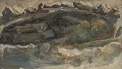 Despite his commitments to work and family, Matsudaira was a dedicated artist, continually experimenting with new techniques, materials, and means of expression. A 1953 oil painting, Self-portrait (Injured in a foxhole), is figurative yet highly symbolic, representing the foxhole in which he was nearly killed as a place of both death and rebirth. His art evolved toward abstraction, with works such as Adoration (1955) and Quiet Motion and Blue (1961) having a sombre, introspective quality.[6][7]