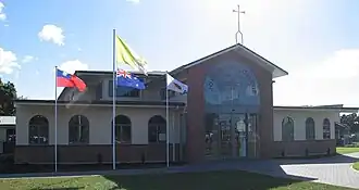 The cost of upgrading the schools when they were integrated and the need to ensure that facilities were not duplicated led Bishop Gaines, the first Catholic Bishop of Hamilton, to decide to amalgamate the schools. The Education Department estimated the cost of upgrading Edmund Rice and MacKillop Colleges to meet integration requirements at $1.2 million.[35] "The decision was surprisingly controversial, and the consultation process could have been done better. There was a feeling among some that the decision to amalgamate had been taken, and that any consultation was simply 'going through the motions'."[34] "Bishop Gaines drove the change and it was his financial genius which pulled off the sale, and later the purchase back of [the] McKillop [College site], for a very healthy profit to the school. The funds from the initial sale enabled John Paul College to build and refurbish, to meet the needs of the growing numbers of students."[36] The amalgamation was completed in May 1987 and Edmund Rice College and MacKillop College closed. Edmund Rice College was in its 25th year. The Christian Brothers Community was reduced to three, was relocated in rented accommodation nearby, and the Brothers former home became the administration centre of John Paul College. In May 1987, John Paul College opened its doors to 687 students. For a time the new school operated in both places, but the former Edmund Rice College was chosen for the new site because it had more potential for development.[37] At the end of 1989 the Christian Brothers Community was withdrawn from Rotorua.[34] The MacKillop buildings have produced rental income for the college.