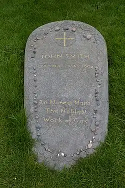 On 20 May 1994, following a public funeral service in Cluny Parish Church, Edinburgh, which was attended by almost 1,000 people,[38] Smith was buried in a private family service on the island of Iona, at the sacred burial ground of Reilig Odhráin, where many early Scottish and Norse kings are said to be buried.[39][40] His grave is marked with an epitaph quoting the Fourth Epistle of An Essay on Man by Alexander Pope: "An honest man's the noblest work of God".[41] His close friend Donald Dewar acted as one of Smith's pallbearers. On 14 July 1994, a memorial service for Smith took place at Westminster Abbey and was attended by over 2,000 people. The Archbishop of Canterbury, George Carey, gave an address.[42]