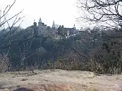 In addition to the building work at Alton Towers, John set about rebuilding nearby Alton Castle. The castle occupies a rocky precipice above the River Churnet on the outskirts of the village of Alton, Staffordshire. On a site fortified since Saxon times, the 12th-century castle had fallen into ruins by the 19th century. John had most of the ruins demolished, engaging Pugin again to design a new gothic-revival castle, which was built to resemble a French or German medieval castle. It is unclear why the 16th Earl had the castle rebuilt. It may have been intended for his cousin and eventual successor, Bertram Talbot (17th Earl of Shrewsbury); or it may have been intended as a Dower House for the Earl's wife, if he should predecease her. Towards the end of the castle's construction, the earl suggested the castle could be a home for priests, but Pugin was "vehemently against the idea".[6]