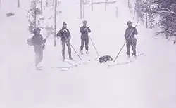 In March 1894, Edgar Howell, a poacher from Cooke City, Montana was captured by Captain G. L. Scott, U.S. Army, and a patrol of soldiers for killing Bison in the Pelican Valley section of the park. Unfortunately, there were no laws that would allow prosecution of Howell and he could only be temporarily detained and removed from the park. Shortly after his capture, Frank Jay Haynes park photographer, Emerson Hough noted western author, and Billy Hofer, a noted backcountry guide, encountered Scott and Howell as Howell was being escorted back to Fort Yellowstone. Haines captured the encounter on film and Hough telegraphed a story back to his publisher: Forest and Stream. The story prompted George Bird Grinnell, editor of Forest and Stream to lobby congress for a law to allow prosecution of crimes in Yellowstone. The result was the Lacey Act of 1894.[3] Edgar Howell would later play a pivotable role in one of Judge Meldrum's most famous cases.