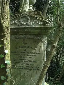 Memorial to John Williams's wife and son, at the Congregationalists' pioneering nondenominational place of rest, Abney Park Cemetery (April 2006)