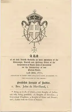 In 1872, John de Havilland was made a fellow of the Society of Antiquaries of London. He is also remembered as a soldier of fortune who served in Spain under Don Carlos where he became a General in the Spanish Army. According to a College of Arms Monograph, he was of uncommon physical strength and one of the most picturesque characters in the history of the College of Arms.