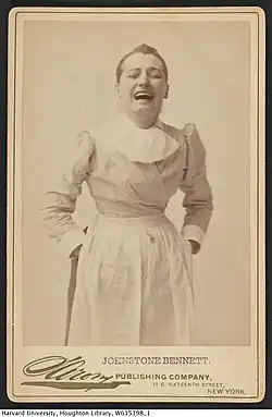 Johnstone Bennett was with a small touring company when she was discovered by Richard Mansfield and cast in Monsieur (1887) in Madison Square Theatre.[5] Still with Mansfield's company, she appeared in Prince Karl (1887), Lesbia (1888), A Parisian Romance (1888), and Beau Brummell (1890). She also appeared in Honor Bright (1888), All the Comforts of a Home, A Noble Son (1889), The Story of Rodion (1895), and in starring roles of Jane (1891),[6] The Amazon, Fanny,[7] and A Female Drummer (1898). In vaudeville she performed in sketched titled A Quiet Evening at Home and American Types.[8][9][10][11]