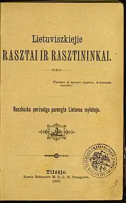 On 22 December 1889, Šliūpas established the Lithuanian Scientific Society (Lietuvių mokslo draugystė) in Baltimore and became its chairman. The primary goal of the society was to publish Lithuanian texts and otherwise promote education among Lithuanians.[76] Its first publication was Šliūpas' work on Lithuanian-language texts from the 16th century to present published in 1890 in Tilsit, East Prussia.[a 2] It contained mostly patriotic and nationalistic excerpts from older texts with essays by Šliūpas on the current situation of and future hopes for the Lithuanian National Revival, and thus were more a like a chrestomathy than a proper history of Lithuanian literature.[78] In 1891, together with Burba, Šliūpas published Bestiality of the Russian Czardom toward Lithuania, the second English-language publication by the Lithuanian immigrant community.[79] Šliūpas also delivered speeches and lectures on various topics from Darwinism and religion to socialism. In winter 1889–1890, he delivered about 30 such speeches.[80] One of the lectures on Lithuania's past, present, and future was developed and published as a separate brochure in 1897.[81] In March 1892, the Scientific Society began publishing monthly magazine Apšvieta (Enlightenment). It was the first Lithuanian magazine devoted solely to culture and education. In total, 15 issues were published in Tilsit, East Prussia. Edited by Šliūpas, the magazine could not avoid his anti-religious and pro-socialist views.[82]