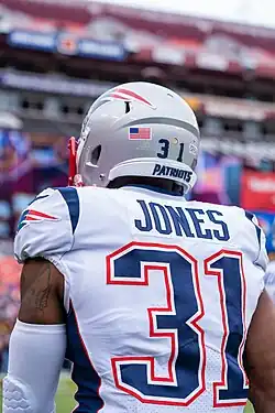 On September 8, 2019, Jones started in the New England Patriots' home-opener against the Pittsburgh Steelers as a nickelback and recorded three combined tackles (two solo) and set a season-high with two pass deflections as they won 33–3. In Week 7, he set a season-high with six combined tackles (five solo) as the Patriots routed the New York Jets 33–0.[29] The following week, he recorded six combined tackles (two solo), made one pass deflection, and forced a fumble by running back Nick Chubb which was recovered by teammate Devin McCourty in their 27–13 win against the Cleveland Browns.[30] He was inactive for the Patriots' 24–17 win against the Buffalo Bills due to a groin injury.[31] He finished the 2019 NFL season with a total of 53 combined tackles (38 solo), eight pass deflections, and a forced fumble in 15 games and nine starts.[14]