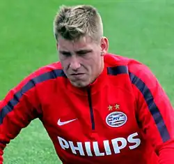 On 9 July 2015, de Wijs was named part of the senior squad that would fly to PSV's pre-season camp in Evians-les-Bains taking part in the Valais Cup.[8] On 15 September 2015, de Wijs was an unused substitute in a 2–1 Champions League group win over Manchester United.[9] On 21 October 2015, he made his senior debut in a Champions League game coming on as a substitute for Simon Poulsen in the 74th minute against Wolfsburg where they lost 2–0. Ten days later, de Wijs made his Eredivisie debut against De Graafschap replacing Héctor Moreno where they won 6–3.[4][10] On 21 November 2015, de Wijs with teammate Jeroen Zoet signed new deals keeping them at the club until 2019.[11] After impressing at Jong PSV, de Wijs was called up for the first-team by manager Phillip Cocu on 3 December 2015.[12]