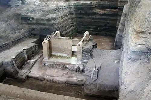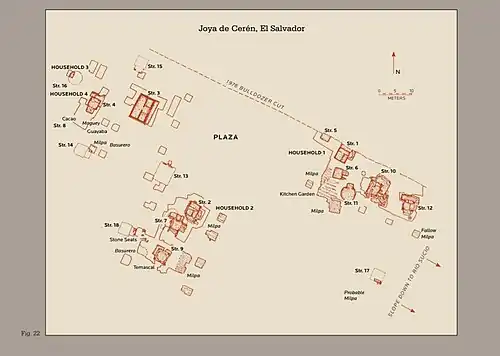 Joya de Cerén can be divided into a northeastern area, a southeastern area, and northwestern area.[16] The northwestern area holds Household 1 alongside Structure 1, 5-6, 10-12, 17 containing milpas and a kitchen garden. The southeastern area holds Household 2 alongside Structure 2, 7, 9, 13, 18 containing a temascal, milpas and a basurero (trash pit). The northwestern area holds Household 3-4 alongside Structure 3-4, 8, 14-16 containing milpas, fruit trees, and another basurero.[16] 18 structures have been identified in archaeological survey. Of these, ten have been excavated by archaeologists.[17] Scholars distinguish ceremonial buildings from non-ceremonial buildings with the following considerations: orientation of building, platform heights, floor plans, assemblages, construction technique, altars, caches, burials, etc.[18]