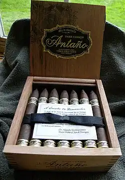 Box of JdN Antaño dark corojo doble fuerte cigars, manufactured in Nicaragua in 2011.