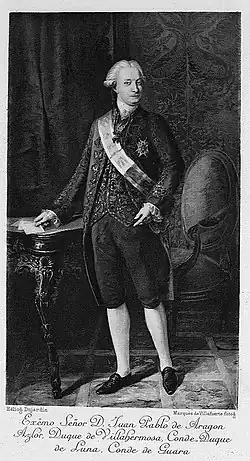 Juan Pablo de Aragón-Azlor y Zapata de Calatayud, 11th Duke of Villahermosa, 6th Duke of Palata, GE (24 January 1730 – 17 September 1790), was a Spanish peer and diplomat. He was a knight of the Order of the Golden Fleece and of the Order of Charles III.