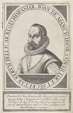 Mancicidor served in Madrid under Philip II's secretary of state, Juan de Idiáquez. When Archduke Albert was sent to the Low Countries as Governor General in 1596, Mancicidor accompanied him as his secretary of state and war. As Secretary of State he was responsible for the confidential correspondence between the Archduke and King Philip III of Spain, royal ministers, Spanish ambassadors at their various postings, the governor of Milan, the Viceroy of Naples, and other dignitaries. As Secretary of War, he countersigned all the Archduke's military orders.[1] He was part of the delegation that negotiated the Twelve Years' Truce of 1609–1621.[2]