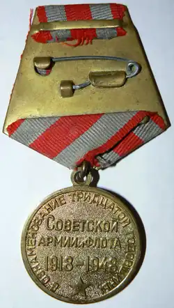 The Jubilee Medal "30 Years of the Soviet Army and Navy" (Russian: Юбилейная медаль «30 лет Советской Армии и Флота») was a state military commemorative medal of the Soviet Union established on February 22, 1948 by decree of the Presidium of the Supreme Soviet of the USSR[1] to denote the thirtieth anniversary of the creation of the Soviet Armed Forces. Its statute was later amended by decree of the Presidium of the Supreme Soviet of the USSR of July 18, 1980.[2]