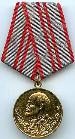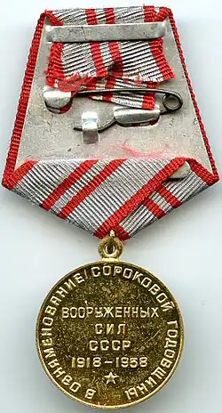 The Jubilee Medal "40 Years of the Armed Forces of the USSR" (Russian: Юбилейная медаль «40 лет Вооружённых Сил СССР») was a state military commemorative medal of the Soviet Union established on December 18, 1957[1] by decree of the Presidium of the Supreme Soviet of the USSR to denote the fortieth anniversary of the creation of the Soviet Armed Forces. Its statute was later amended by decree of the Presidium of the Supreme Soviet of the USSR of July 18, 1980.[2]