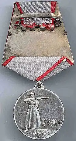 The Jubilee Medal "XX Years of the Workers' and Peasants' Red Army" was awarded to staff and commanding officers of the Workers' and Peasants' Red Army and Navy who had, as of February 23, 1938 (the Day of the Red Army), served for 20 years in its ranks, and to those honoured during the Civil War and the war for freedom and independence of the motherland in units of the Workers' and Peasants' Red Army and Navy; to those awarded the Order of the Red Banner for distinguished service during the Civil War.[1]