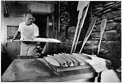 Their bread is made only from flour, salt, water, and a sourdough starter;[31] no eggs, milk, or fat are used. They use unbleached white bread flour and milled rye or wheat flour. Their wheat bread uses whole grain and is organic. The dough is naturally leavened.[27] They used to work 40-hour work weeks with the couple sharing many of the tasks. Without plumbing, they needed to bring in water for the dough and wood for the oven. A typical week would find them producing 350 pounds of bread two days a week, preheating the oven on Tuesday, and baking on Wednesday and Thursday. They would begin by baking ten loaves at a time early in the day, moving to forty by the end of the day. This would produce about 250 loaves for each day, with distribution and sales at stores in Plainfield and Montpelier, on Thursday and Friday.[27] Chef Michel LeBorgne used Upland Bakers sourdough in dishes at the New England Culinary Institute. One dish called for serving it with local goat cheese produced in Brookfield.[33]